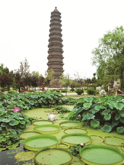 耸立在开封市东北隅五十多米高的十三层铁塔,建于北宋皇祐元年(公元1049年),塔身以铁色琉璃砖砌成,故称铁塔。塔砖上塑有坐佛、立僧、飞天、麒麟、宝相花等各种花纹图案,工艺精美,形象生动。每个塔檐转角处均挂有铜铃,和风吹拂,叮咚作响,清脆悦耳。铁塔可以从北面盘旋而上,登至极点,举目远眺,一望无际的豫东平原,田连阡陌,河渠纵横,在天与地的衔接处,一水若带,这就是“奔流到海不复回”的黄河。