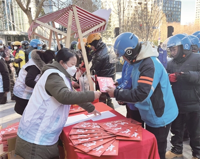 本报讯 (记者 刘欣欣) “天气冷,您进来喝杯姜茶吧。”近日,“‘驿’起出发 温暖回‘家’路”@新邻里暖冬守护活动在朝阳区建外街道万达骑士驿站举行,为新就业形态劳动者送上一杯热姜茶、一份暖心餐、一份暖“新”守护包,让新就业形态劳动者在寒冷的冬日感受到浓浓的温暖和关怀。