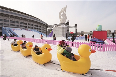 2024至2025雪季,国家体育场“鸟巢”欢乐冰雪季、国家速滑馆“冰丝带”冰雪狂欢季等活动相继开展,2023年改造复建后的北京首座国际标准专业足球场——“新工体”,也开启了首届“燃DONG冰雪乐园”,吸引众多游客游玩体验。北京体育地标迎来新一轮冰雪热潮。图为游客在北京工人体育场的“燃DONG冰雪乐园”体验雪地小火车。