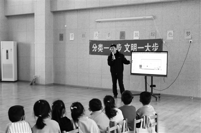 为进一步提高少年儿童对垃圾分类的知晓率和参与度,近日,通州区于家务回族乡综合行政执法队开展“‘童’心协力,小手拉大手”垃圾分类科普宣传进校园活动。执法人员通过播放视频、课件讲解的形式,为孩子们传授垃圾分类知识。本报记者 彭程 摄影报道