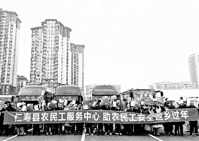 春节将至,眉山仁寿县农民工服务中心开展“农民工返乡·春风行动”,迎接仁寿籍返乡的农民工回家。1月13日上午,4辆载满100名返乡农民工从成都东客站出发的大巴车顺利到达仁寿县。(1月15日 《四川工人日报》)