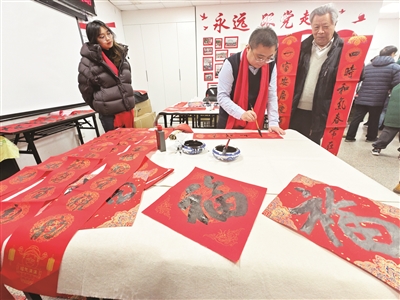 昨天,西城区书法家协会成员来到椿树园社区为居民现场书写春联和“福”字。据悉,在新春佳节即将来临之际,椿树街道邀请百名书法家走进辖区书写“福”字。活动期间还将为辖区内的消防战士、外卖配送员、快递员送上新春的美好祝愿。本报记者 孙妍 摄影报道