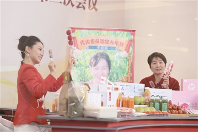 正在召开的北京两会恰逢蛇年春节到来之前,市人大代表在履职之余化身推荐官,带着“热门爆款”好物走进新闻演播室,以访谈的形式,讲述自己所在地区或领域的发展变化,为家乡的特产代言。图为平谷团代表岳巧云推荐家乡的富硒黑小麦粉、冰糖葫芦、草莓等多种优质特色产品。