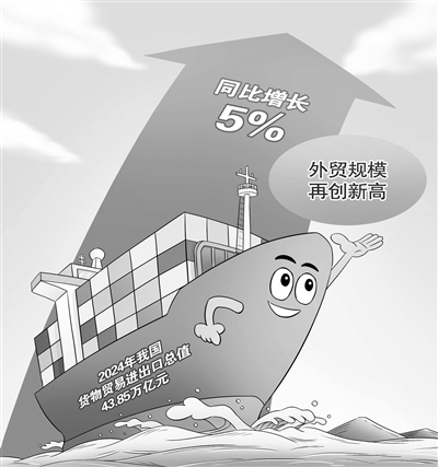 海关总署13日发布数据显示,2024年,我国货物贸易进出口总值43.85万亿元,同比增长5%。中国外贸经受住多重挑战,规模再创历史新高。(1月13日 新华社)□王琪