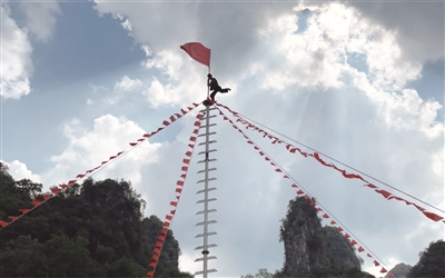 “这么多锋利得能刮下胡子的长刀(节前两天就已磨好的刀),怎能赤足爬上去呢?”正当我猜想时,突然数千双眼睛转向从坡头小屋里跑出的五个身着红衣裳,头戴红包头,光着脚的勇士。他们健步来到刀杆下,纵身跳上刀杆,双手握住刀口,双脚踩着刀刃,像爬梯子一样,灵活矫健地一步步向上攀登。最先爬上顶端的人,还要做高难度倒立动作,几千名观众仰面观看,不时爆发出阵阵热烈的喝彩声。