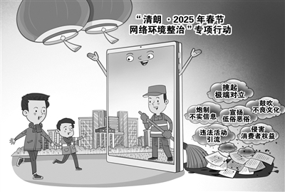 记者19日从中央网信办获悉,为了营造喜庆祥和的春节网络氛围,中央网信办决定即日起开展为期1个月的“清朗·2025年春节网络环境整治”专项行动,进一步聚焦春节期间网民常用的平台环节和服务类型,集中整治人民群众反映强烈的网络生态问题。(1月19日 新华社)□朱慧卿