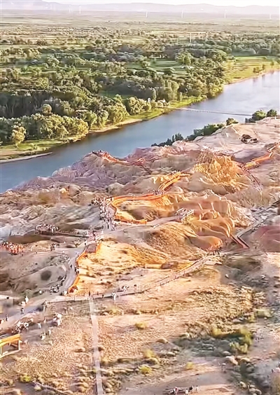 游览五彩滩,不必攀爬无需跋涉,环绕景区的栈道,能将游客引入各处景点,让人们轻松地纵览五彩滩全貌。特别是那些观景台,不仅名字充满诗意,也与所观览的景象很贴切。层层叠叠流光溢彩的丘陵,犹如在海面上轻盈跳动的波浪,这是在“雅丹似锦”观景台上看到的场景;浑圆的石峰,笔挺的石柱,光影变幻绚丽夺目,这是在“彩滩奇观”观景台欣赏到的景象;洒满天际的霞光,镀满金色的夕阳,与五彩滩相互融合,让人难分天上人间,这是在“朝夕映趣”观景台看到的……五彩滩的每一个观景台,都能一眼尽揽绝佳的景色。