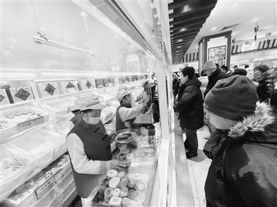 春节将至,记者昨天从北京稻香村了解到,目前糕点礼盒进入销售旺季,从1月中旬开始,各门店客流量明显增加,糕点柜台迎来售卖的高峰期。据统计,北京稻香村每天的销售额为平日的3倍,糕点每日销量近300吨,熟食销量约100吨。本报记者 孙妍 摄影报道