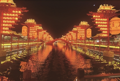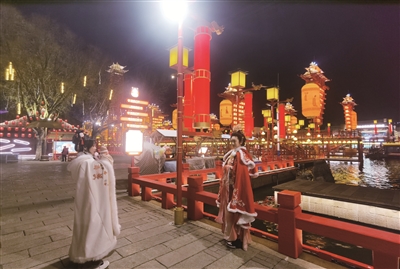 在河北唐山河头老街,古色古香的建筑,充满韵味,精致的灯笼上,描画的仕女姿态婉约。“我们早就听说唐山河头老街再现了水上的大唐盛景,所以就穿了古装,做了精致的发型来拍照,我们准备与家人在这里过个有唐文化味儿的大年。”游客谢女士抢先前来体验。