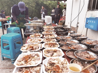 “26桌,每桌要备16道硬菜,凌晨5点团队就赶到现场了。”丁二娃说。10人团队在院坝里划出流水线,切菜、配料、炒菜、蒸菜,4人负责切菜,两姐妹负责清洗餐具,一人守着五层大蒸笼把控火候,还有两人负责给到现场参加寿宴的客人倒茶水。