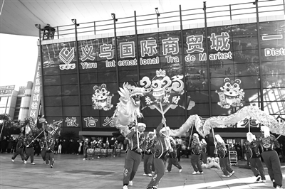 2月9日,全球最大的小商品批发市场——义乌国际商贸城迎来蛇年开市。市场商户准备就绪,迎接全球客商前来采购。图为舞龙队在现场进行表演。