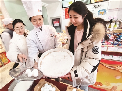 元宵节临近,北京稻香村第三营业部邀请顾客体验手摇元宵。记者在现场看到,元宵制作站台摆着馅料、糯米面粉和手摇元宵的工具,工作人员手把手教顾客手摇元宵的方法和技巧。北京稻香村相关负责人介绍,今年稻香村共推出5种口味的元宵、10种口味的汤圆,既有桂花山楂等传统馅料,也有粗粮细作的黏高粱米汤圆,同时为偏好低糖口味顾客准备了糖醇汤圆。本报记者 孙妍 摄影报道