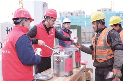 活动中,青岛滨海国际中心项目负责人带领青年志愿者团队走进施工现场,向每位职工致以诚挚的问候与感谢,递上一杯热气腾腾的姜汤和红枣银耳羹,并发放暖贴等御寒慰问品,同时叮嘱他们在寒冷的天气中要注意保暖,确保身体健康与工作进度“两不误”。职工们纷纷表示,要将这份温暖转化为工作的动力,以更加奋发有为的姿态投入到项目建设中。