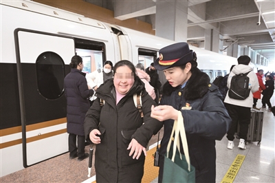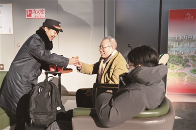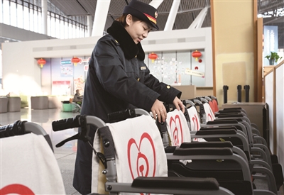 走进北京朝阳站京铁爱心服务区,装点在墙壁上的大红灯笼和春联格外夺目。“这几天北京较冷,请您注意保暖!”客运员陶志婷、曹晶、王硕将一杯杯热水递到候车的重点旅客手中。一名乘坐轮椅的女性旅客在家属陪伴下进入爱心服务区,两名客运员立刻协助家属将患有腿疾的旅客搀扶到沙发上。“春运期间客流量大,我们日均接到的重点旅客服务工单有130单左右。”陶志婷刚回到服务台前,对讲机中传来了同事的呼叫,她又马不停蹄地赶往站台层,接一名到京的视障旅客。