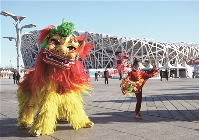 2月12日,元宵节,北京市文化和旅游局、中国非物质文化遗产馆、朝阳区人民政府主办2025“京彩中轴线 非遗过大年”系列非遗特色春节庆祝活动。其中,在奥林匹克公园北顶娘娘庙至鸟巢南广场一线举办的非遗展演巡游活动中,北京的狮舞(白纸坊太狮)、浙江的龙舞(浦江板凳龙)、福建的闽西客家元宵节庆(连城姑田游大龙)、陕西的老庙老鼓汇聚于此,为观众献上喜庆热闹的表演。