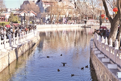 2月18日,迎来雨水节气,是二十四节气之中的第二个节气,也是今年春季第二个节气。此时节,雨滴落在田野里,草渐绿、花始开,春回万物兴。图为昨日什刹海内,“春江水暖鸭先知”,野鸭在湛蓝的湖水中游弋。