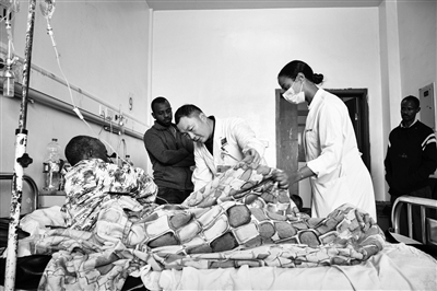 中国第25批援埃塞俄比亚医疗队于2024年5月抵达埃塞俄比亚,在首都亚的斯亚贝巴的蒂鲁内什-北京医院开展援外医疗任务。图为中方泌尿外科医生李浩和当地医护人员近日在病房检查一名术后患者恢复情况。 新华社发