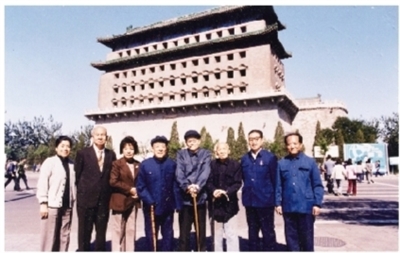 顾伯岳:在我们北京市曲剧团的走廊里,悬挂着一幅珍贵的历史照片,是1986年在前门箭楼前相聚的几位老人,他们都是当年群艺社的主要成员。三十多年后这些当年共同创业的老伙伴,再次回到故地为曲剧寻根,镜头记录下了这一意义非凡的时刻。