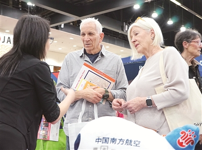 美国规模最大的旅游展洛杉矶旅游展近日在洛杉矶会展中心闭幕。在为期两天的展会上,中国展台以春节文化和冰雪旅游为主题,为美国游客呈现了中国丰富的文化遗产和多样化冬季旅游体验。图为人们在美国洛杉矶旅游展上参观中国展台。
