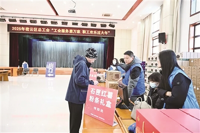 2025年春节前夕,密云区总工会热闹非凡,持续9天的2025年“工会服务惠万家 职工欢乐过大年”活动落下帷幕。前来领取免费年货的职工在工会干部的指引和帮助下,拿到了自己预定的年货。“今年的活动依旧采取网上预定、线下领取的方式开展。职工可根据自己的喜好,预定相关年货。”工作人员介绍。