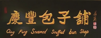 多年来,“庆丰包子铺”的匾额一直沿用普通的楷书。1999年,该店特意请书法家徐柏涛题写了匾额。
