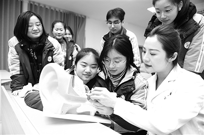 3月3日全国爱耳日来临之际,各地开展形式多样的主题活动,宣传爱耳护耳知识,关爱听力健康。图为四川省南充高级中学临江校区,川北医学院附属医院的医师为同学们讲解耳朵构造及科学护耳知识。 新华社发