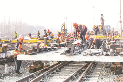目前,道岔换新战正酣。北京工电大修段线路大修三车间的200余名施工人员,投身到古冶站站区林10号道岔的更换作业中。“此次更换的林10号道岔重量大,但铺设精度却必须控制在毫厘之间,既考验我们的体力又考验技术。”施工负责人梁民利语气坚定。