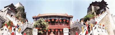 一到平谷刘家店,向西北方向望去,丫髻山山高林密,苍松翠柏,郁郁葱葱,山顶之上,有两座庙宇建筑群耸于山巅,一东一西,西山顶上的庙宇呈方形,东山顶上的庙宇呈圆型,它们好像一对孪生的吉祥龙凤,在天空中飞舞欢腾,它们又好像一道霞光,照耀着前来登攀的人。缓步来到太极广场,穿过一座气派的“丫髻胜境”牌坊,就到了丫髻山脚下,来时正值丫髻山举办庙会,一抬眼,山上彩旗飘飘,大红灯笼高高挂,就连台阶上也印制了一个个大大的“福”字灯笼,下面挂着长长的福带,这番操作方便过往游客打卡拍照,好让每人都沾上喜气和福气。一年一度的丫髻山传统文化庙会,兴盛于明清时期,是华北四大庙会之一,每年四五月间,京、津、鲁、晋、豫等地善男信女纷纷来此朝山进香,有时多达数万人。在清代,就有4位皇帝17次驾临丫髻山,其中康熙到过2次,乾隆到过7次,嘉庆到过6次,道光到过2次,这极大地推动了道教的发展,也提高了丫髻山的社会地位和影响力。