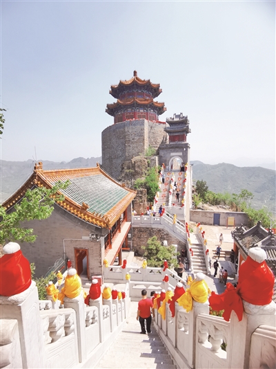 往上攀,三步一庙,五步一殿,处处皆是烧香祈福诵经之所。其实,丫髻山山上山下建筑群大致分为三组,山脚下主体建筑为紫霞宫殿群,有紫霄宫、观音堂。山腰为回香亭建筑群,这里既有东岳庙、回香亭,还有五尊菩萨殿、慈航殿、三官殿、眼光娘娘殿。过了回香亭,一阵阵风吹玉振的清脆铃声传来,让我们不由加快脚步,原来这里藏着一处网红打卡地,只见一根根铁丝上系着一个个祈福铃,祈福铃上系着一条条祈福带,上面写着各种祈福的话句,“我在丫髻山为你祈福”“福地丫髻,带福回家”“所求如所愿,所行化坦途”……
