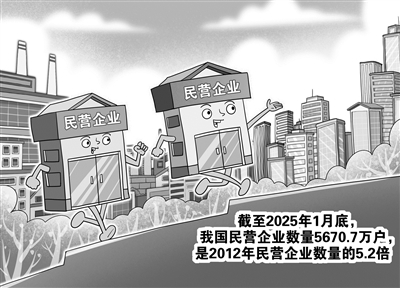 记者6日从市场监管总局获悉,截至2025年1月底,我国民营企业数量5670.7万户,是2012年民营企业数量的5.2倍。国家高新技术企业中,民营企业从2012年的2.8万家增长至42万多家,占比由62.4%扩大至92%以上。(3月6日 新华社)