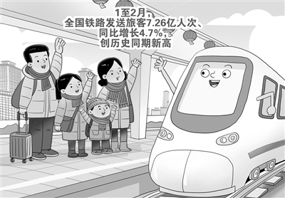 记者10日从中国国家铁路集团有限公司获悉,1至2月,全国铁路发送旅客7.26亿人次、同比增长4.7%,创历史同期新高,运输安全平稳有序。(3月10日 新华社)□朱慧卿