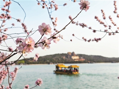 近日,京城温度走高。颐和园西堤呈现“桃花朵朵开”的美丽景观,粉白色的花簇与西堤的古建、昆明湖游船相映成趣。