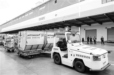 3月13日,两辆无人驾驶货物牵引车在杭州萧山国际机场投入试运行。该型无人车基于通用自动驾驶技术打造,搭载了激光雷达、摄像头与定位系统,可做到厘米级精确定位,能够在机坪作业中实现多车协同、精准停靠装卸货、监测飞机位置自动停车避让等功能。图为无人驾驶货物牵引车。 新华社发