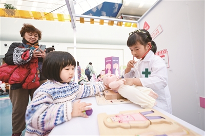 此外,在展览内,孩子们通过展板学习安全知识;在体验区,老师们带领学生借助木质玩具、沙盘灯箱、人体器官识别拼图等道具,了解人体知识;在游戏区,“丢魔方块”“跳房子”“钻圈”等传统游戏让孩子们在传统与现代融合中收获知识;在互动区,温馨的蜜语小屋内,柔和灯光倾洒而下,家长、孩子围坐在一起共读绘本,让安全教育融入温暖的亲子时光。