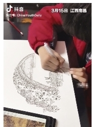 近日,在江西南昌,13岁男孩用圆珠笔画出《清明上河图》。据小孩妈妈介绍,他从3岁开始就特别喜欢画画,现在提笔就能画出自己想要画的东西,一气呵成。(图片及新闻来自中国青年报抖音)