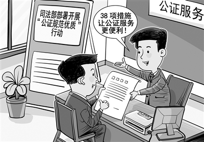 司法部日前在全国部署开展“公证规范优质”行动,在前两年推出的“减证便民”“提速增效”举措基础上,进一步在公证服务“好”字上下功夫,在14个方面采取38项措施,实现“四优化四提升”。活动将从现在起持续至今年年底。(4月5日 人民网)□朱慧卿