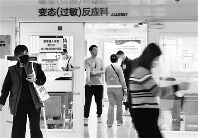昨天,协和医院变态(过敏)反应科候诊的患者众多。据医生介绍,时下正是过敏高发期,今年由于降水量少,圆柏花粉过敏的患者明显高于往年,北京现在已进入飞絮期,柳絮过敏的患者就诊量近日也开始有所增加。在此提醒市民,出行要尽量避开这些树种,并戴口罩和眼镜进行防护。从户外回到室内后,应换掉外套,并用流水洗手洗脸,冲掉皮肤上的花粉。本报记者 孙妍 摄影报道