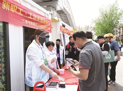 本报讯(记者 张晶) 近日,由北京市总工会主办的“天天都是4·15,携手共筑首都安全防线”职工普法宣传活动,在三里屯太古里南区广场举办。活动现场人头攒动,气氛热烈,通过发放宣传材料、开展法律咨询、展示主题作品等丰富形式,进一步增强了广大职工群众的国家安全意识,营造出“国家安全,人人有责”的良好社会氛围。市总工会党组成员、副主席朱文娇参加活动,并带队调研骑手驿站等。