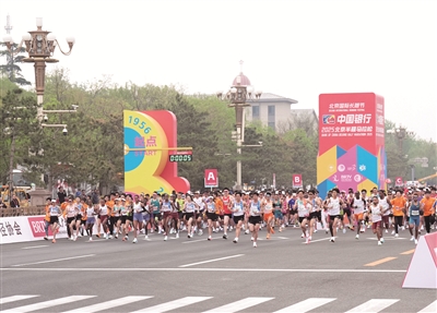 4月20日,2025北京半程马拉松开跑,起点设置在天安门广场,终点为奥林匹克公园中心区景观大道。图为参赛选手从起点出发。