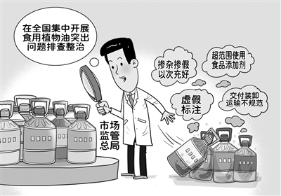 记者从市场监管总局获悉,今年4月至12月,市场监管总局部署各地市场监管部门在全国集中开展食用植物油突出问题排查整治工作,进一步规范食用植物油生产经营行为,切实保障食用植物油质量安全。(4月18日 新华社)□朱慧卿