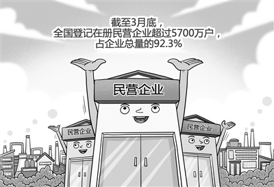 市场监管总局21日发布数据显示,截至3月底,全国登记在册民营企业超过5700万户,占企业总量的92.3%。一季度全国新设民营企业197.9万户,同比增长7.1%,超过过去三年平均增速。(4月21日 新华社)□朱慧卿