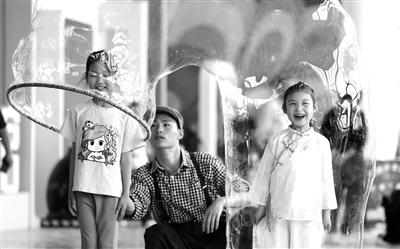 “五一”期间,人们以各种方式游玩娱乐,开心过假期。图为在山东省临沂市郯城县醉东风乡村艺栈,游客体验泡泡秀。