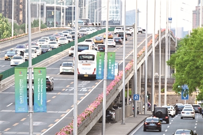 第二十七届中国北京国际科技产业博览会将于5月8日至11日在国家会议中心举办。东三环道路两侧已悬挂大会道旗,迎接盛会。