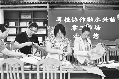 近年来,广西柳州市融水苗族自治县和对口帮扶的广东省廉江市依托粤桂劳务协作机制,不断加强零工市场服务体系建设,在多个易地扶贫安置小区和乡村,建立集就业登记、技能培训、岗位推荐等就业服务功能于一体的一站式服务中心,带动脱贫人口和易地扶贫搬迁劳动力实现就地就近灵活就业。图为在广西融水苗族自治县易地扶贫安置点苗美家园社区,群众在零工市场制作手工艺品。