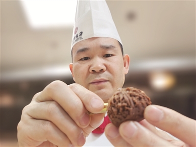 为了让这款面点拥有美观的造型,赵会连也做了很多功课。“我去了故宫,买了窗棱、镶嵌花纹、雕刻纹路的书学习。”在制作时,他还进行了创新。“我没有简单复刻史料记载的制作方法,结合了现代人的口味,食材中加了蔓越莓和青梅干,这款面点收获很多顾客的好评。”