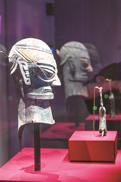四川广汉三星堆出土的戴金面罩青铜人头像和青铜鹰形铃;江西新干大洋洲出土的双面铜人像、兽面纹青铜胄、蝉纹青铜大刀;河南安阳殷墟、陕西清涧寨沟、湖南宁乡炭河里、四川成都金沙等遗址众多代表性文物,珍品、孤品、名品云集……在展厅中,观众可纵览殷商重量级文物“天团”。