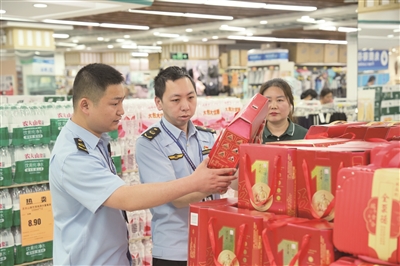 昨天,北京市市场监管局联合朝阳区市场监管局对商场超市、批发市场、餐饮单位、生产企业等场所开展专项监督检查,重点对节日热销的粽子进行抽样检测。图为执法人员进入一家超市,对粽子储存条件、经营环境卫生等进行严格检查。此外,重点对散装粽子开展糖精钠和硫酸铜项目的快速检测,结果均为合格。本报记者 周美玉 摄影报道