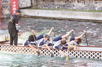 粼粼波光中,不同肤色的划手们一齐摆动划桨,十余支队伍劈波斩浪、竞渡争先。选手中既有青壮年,也有白发苍苍的老人,还有一支由乳腺癌患者组成的队伍。岸边、桥上人头攒动,观众们为龙舟队鼓掌助威。