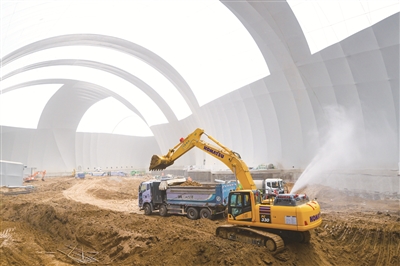 走入气膜内部,十几辆作业车正在热火朝天地施工中,尘土和噪音基本传不到外面。在9台智能风机的运转下,气膜的内部空气质量基本稳定,这个工地不仅会“呼吸”,而且为职工们提供了一个健康舒适的工作环境。风机不但可以输送新鲜空气,当检测到PM2.5等粉尘超标时,系统会立刻自动启动过滤,确保内部空气的洁净。“这个项目毗邻居民区、学校、商业、城市主干道等公共设施,对噪声控制和环境保护的要求比较高,因此,项目采用了基坑气膜技术。”大兴区建设集团项目负责人介绍,项目的气膜覆盖区域为异形投影,最大跨度196.28米,最高点达37.5米,总投影面积为15500平方米,是目前全国最大异型气膜。经过这段时间的数据积累,明显发现气膜能将内部产生的扬尘至少控制90%以上,对于噪音的控制能够降低70%以上,实现了“施工不扰民”的愿景。