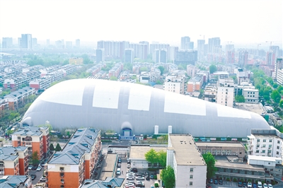 位于大兴区核心城区的林校路街道车站北里1-7号楼房改带危改项目工地,一个巨大的气膜把整个工地罩得严严实实,扬尘、噪音被“闷”在气膜里,大大降低了对周边居民生活的影响。像这样的基坑气膜,全市已经有15个项目正在使用,越来越多的施工项目正在积极践行新质生产力“提质创绿”理念,有效助力“首都蓝天保卫战”。